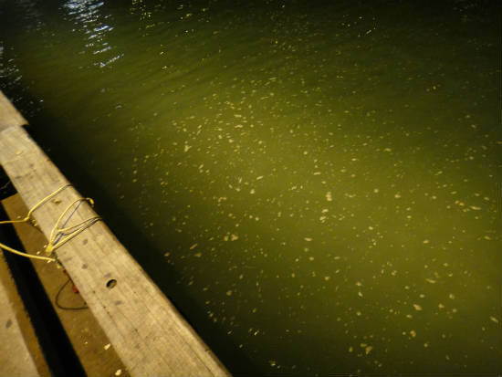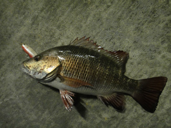最初の一匹は手ごたえ小さく、水面には小さな茶色の魚が浮かび