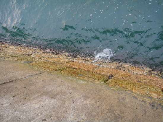 足元でヒットも埠頭下に突っ込まれ、はいつくばりラインを足元のフジツボから必死で守ります
