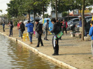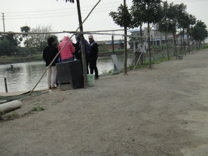 あまりに釣れないので、ラオバンは初心者の子たちを集め、となりの養殖池へ