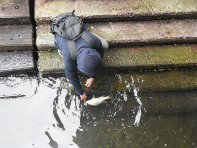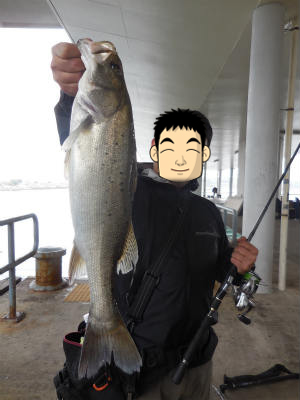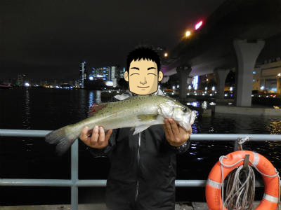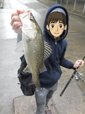 撤収時、エサ釣りのおっちゃんが30センチぐらいのシーバスをゲット
