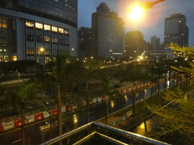 この日の香港、夜は雨こそ小降りでしたが風は強め