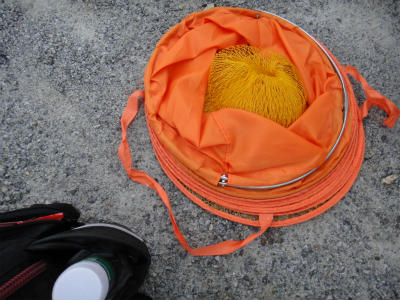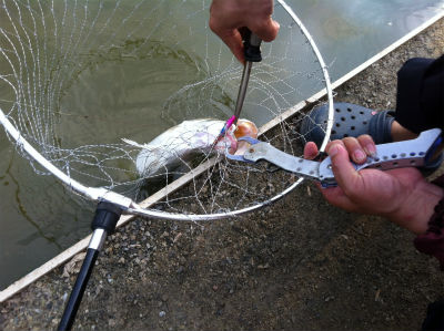 爆釣モードを止めないよう手返しをよくするため、あらかじめ網を池に半分つっこんで置き、横にフライヤーを置いてカメラはポケットに