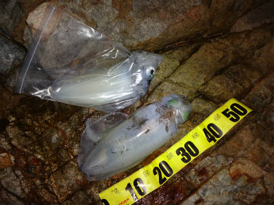 ようやく登りきれて息を整えて見渡すとビニール袋に彼らが釣ったイカが3ハイ