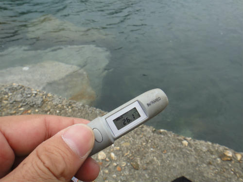 水温27.1度で干潮、これからゆっくりと上げてきます、それにしても向かい風がきつい