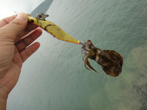 不慣れな操作をする僕のエギを抱いてくれたアオリイカ