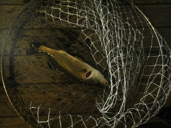 この4匹目は暗くて見えずタモ入れしたら、25cmあるかないかのミニサイズで周囲も失笑