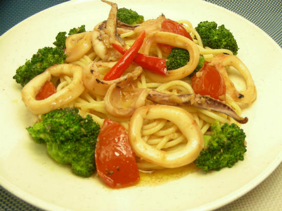 イカと夏野菜のパスタ たいそうな名前ですが、たまたまおばちゃんに野菜もらったので作りました