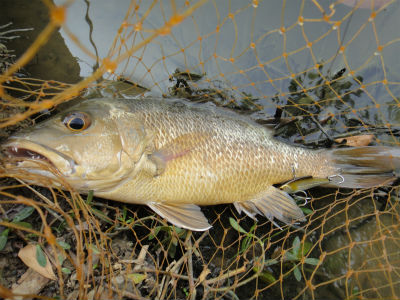 ヒレがボロボロで変色してしまってる生き残りのバラマンディ