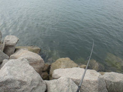 ちょっときついなとは思いましたが、場所をみつけて岸壁から岩越しで開始
