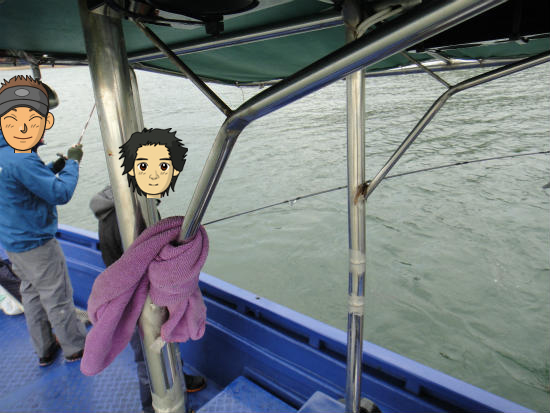 僕の場所は船尾、同船者4人の釣りがよく見えます、研究にはもってこいの立ち位置