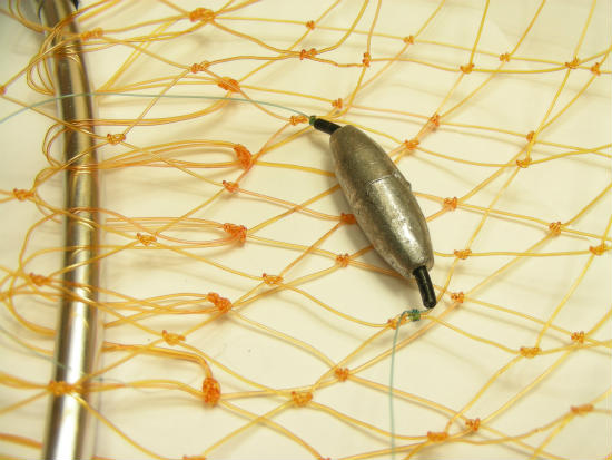 あまっていたシンカーで重りを作り、網が下方向へ下がりふくらみを抑えるように工夫