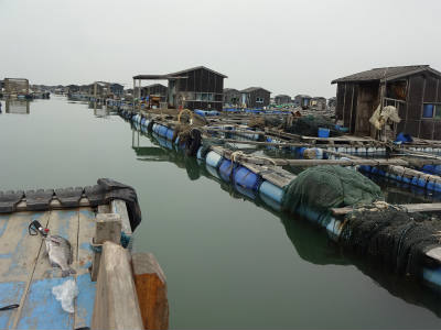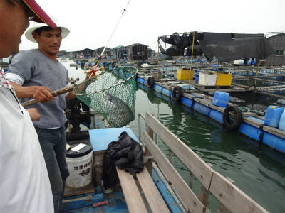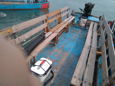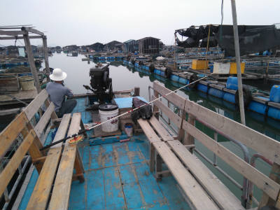 地元の青年の操縦で、養殖所のこんな鉄舟に乗って出船