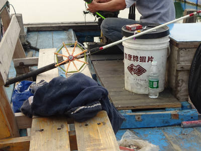 船頭は2メートルほどのグラスソリッドロッドに八卦リールと呼ばれる手巻き式のリール